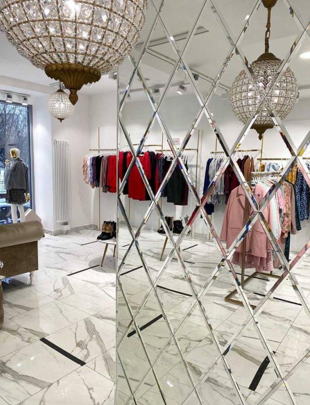 Для украшения использовалась зеркальная плитка формы вытянутый ромб серебряного цвета.